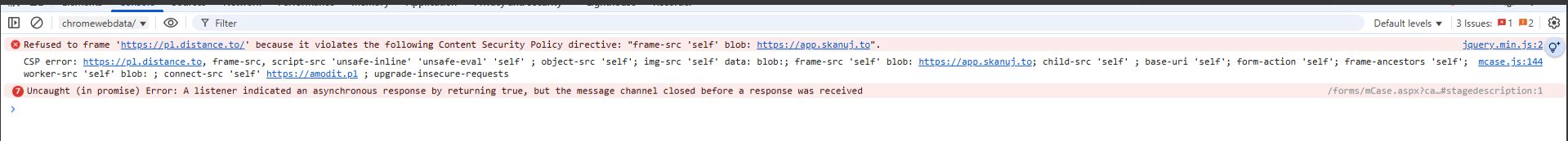 Aby zdiagnozować u klienta ewentualne problemy np. z wyświetlaniem strony w iframe, należy otworzyć konsolę Dev Tools (F12) w przeglądarce i dodać odpowiedni wpis w podanym parametrze w nagłówku „content-security-policy”.