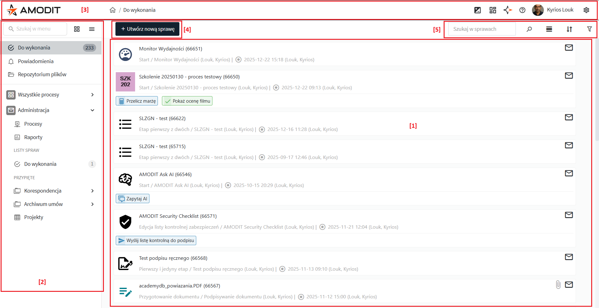 Po zalogowaniu się do systemu AMODIT zazwyczaj wyświetla się lista spraw/zadań „Do wykonania” [1].