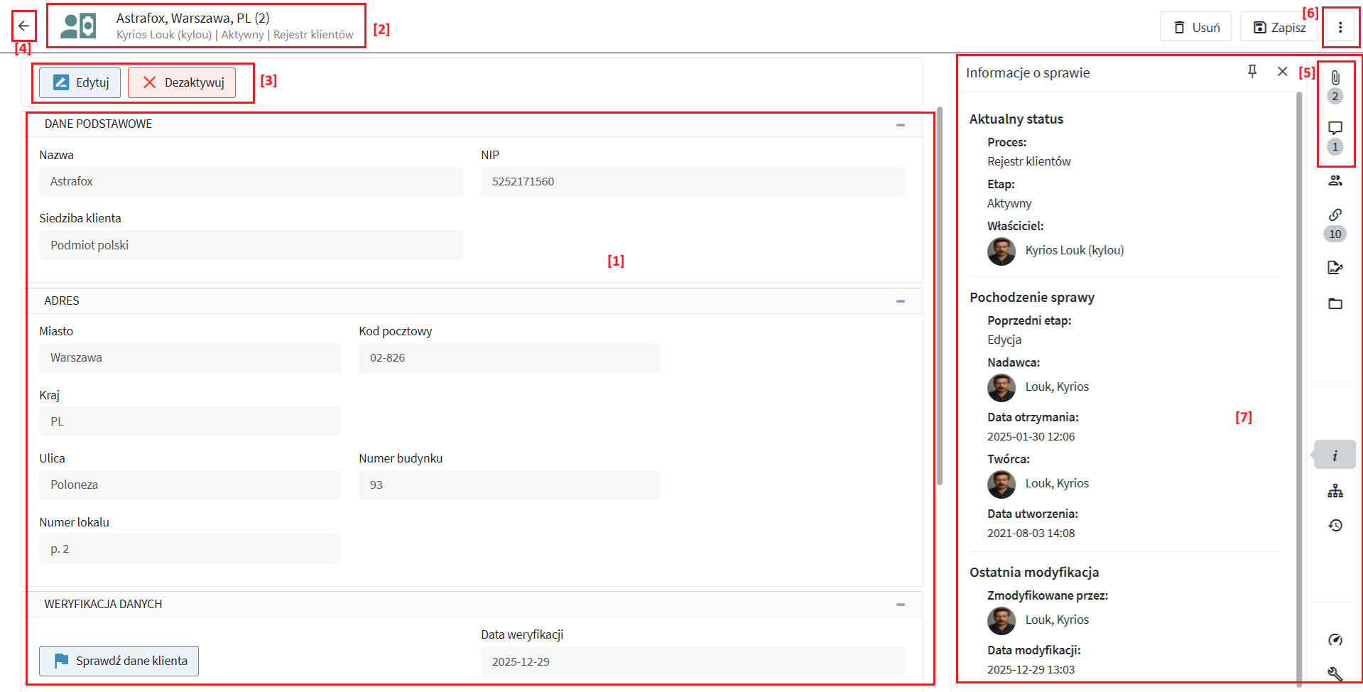 - [1] Główna część formularza, gdzie znajdują się pola (różnego typu), w których przechowywane są dane sprawy. Pola na formularzu mogą być prezentowane w układzie kolumnowym (od 1 do 4 kolumn) i pogrupowane w poziome zakładki albo sekcje rozmieszczone pionowo jedna pod drugą.